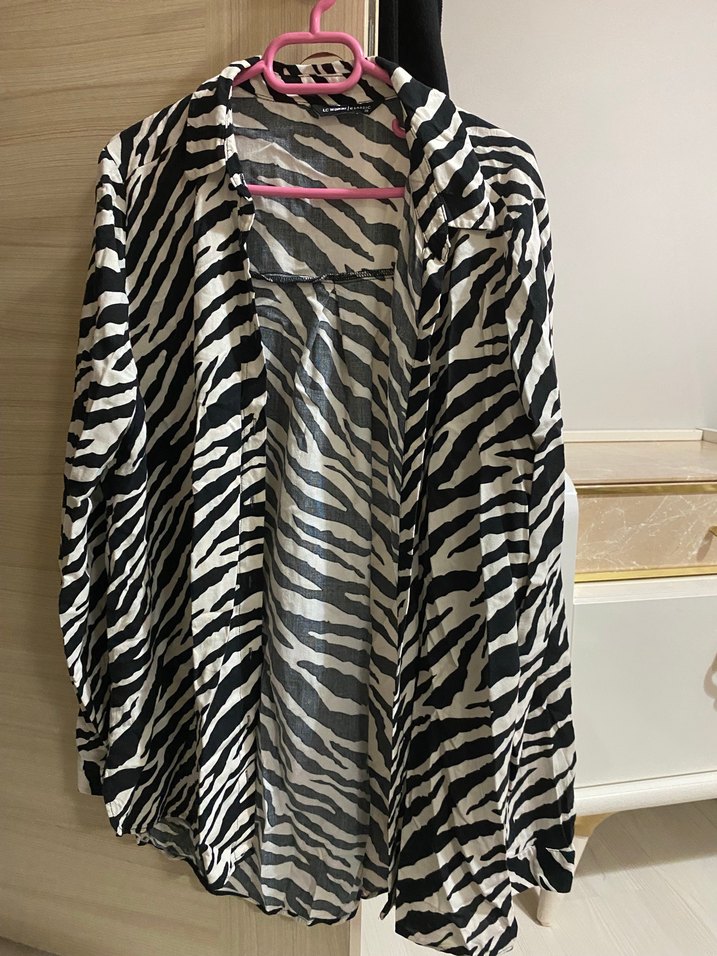 Zebra desenli, uzun kollu, bol kesim kadın gömlek. Drapeli, kayık yaka ve midi boyda, siyah-beyaz renklerde sentetik kumaştan yapılmıştır.