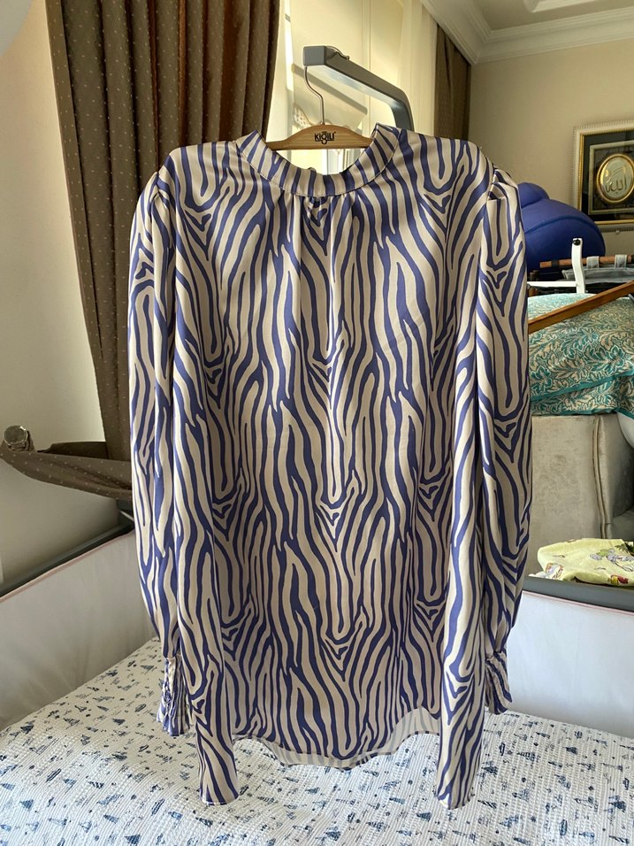Yüksek yakalı, pileli detaylı, bol kesim kadın gömleği. Mavi ve gri zebra desenli, ipeksi dokulu, günlük kullanıma uygun. Tesettür giyme uygun seyyar kemeri mevcuttur