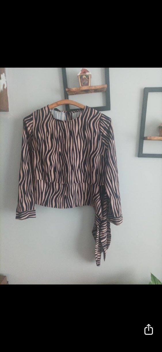 Gri ve kahverengi zebra desenli, uzun kollu, tekne yaka kısa ve bol kesim bluz. Dökümlü detaylarıyla günlük sokak stiline uygun.