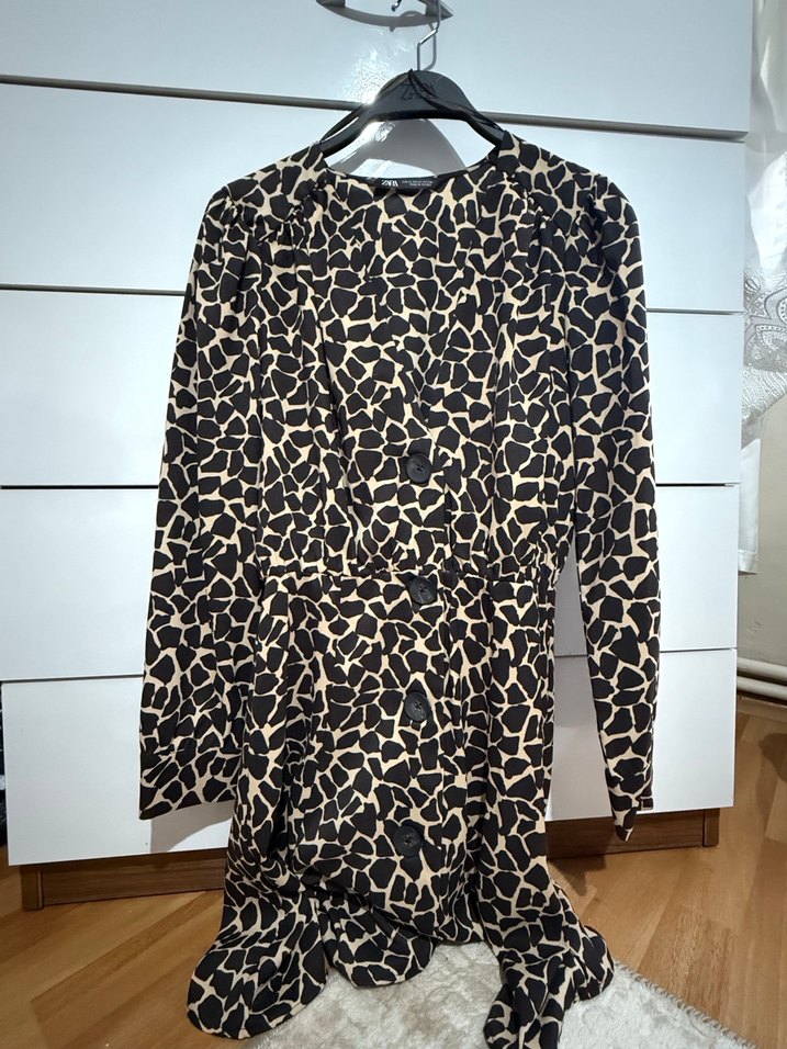 Bu dar kesim mini elbise, uzun kollu ve bisiklet yaka tasarıma sahiptir. Koyu kahverengi zebra desenli, fırfır detaylı ve yumuşak sentetik kumaştan üretilmiştir. Rahat sokak tarzına uygundur.