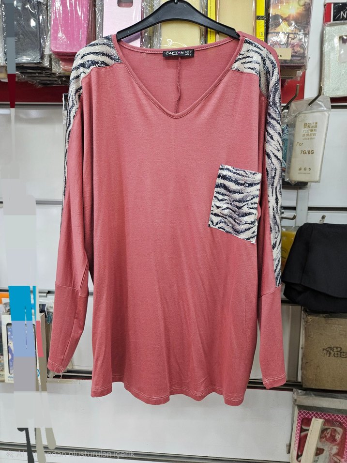 Uzun kollu, V yaka ve bol kesim pembe bluz. Omuzlarda ve cepte zebra desenleri ve pul detaylı manşet detayları bulunur. Yumuşak sentetik kumaştan üretilmiştir.