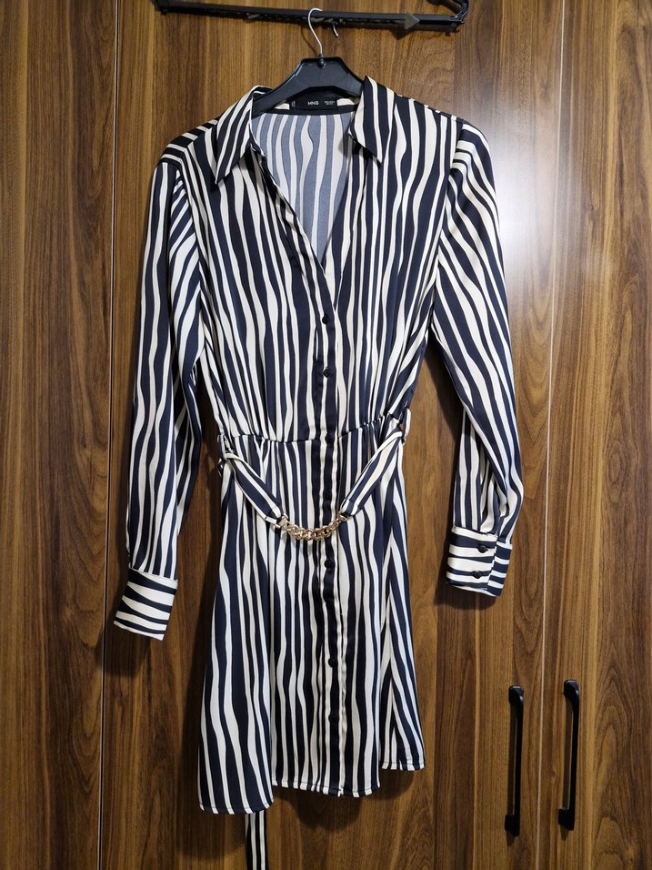 Zebra desenli, uzun kollu, kemerli kadın elbisesi. Notch yaka ve regular fit ile ofis için uygun koyu renk tonlarında.