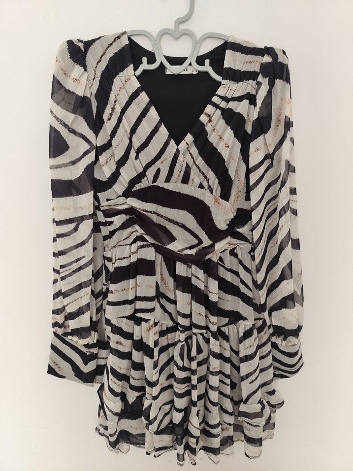 Zebra Desenli Uzun Kollu Şifon Astarlı Mini Elbise