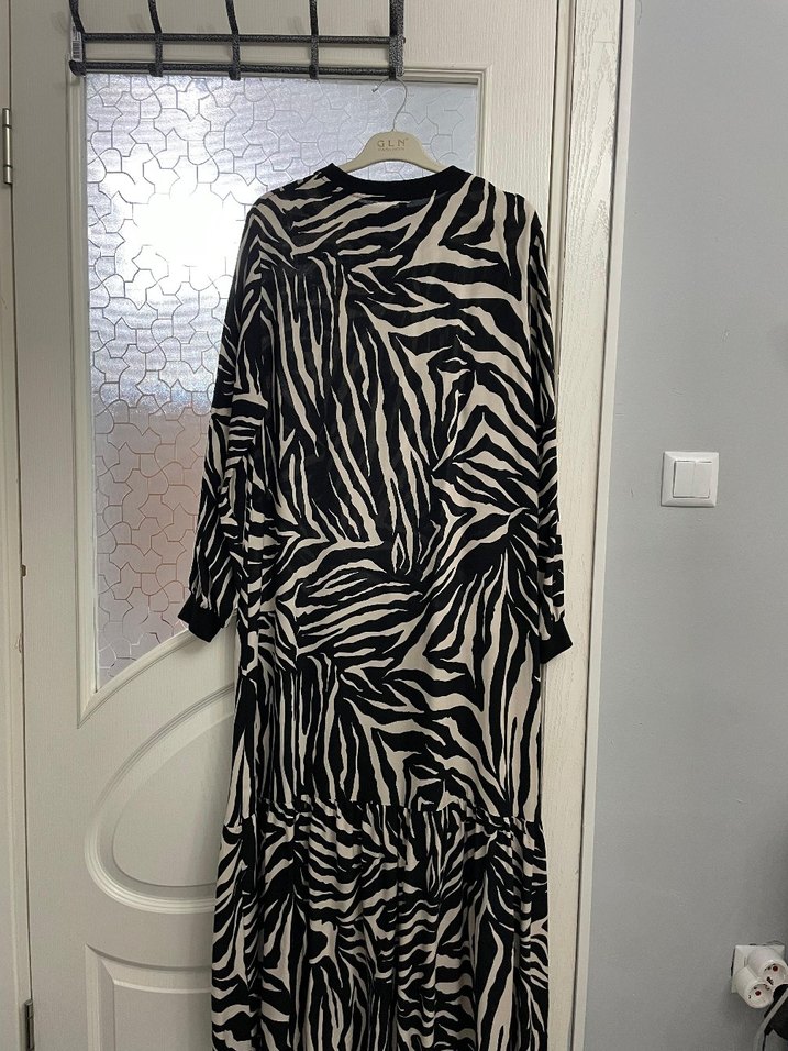 Zebra desenli, uzun kollu ve volan detaylı bol kesim uzun elbise. Yumuşak sentetik kumaştan, V yaka ve bohem tarzda.