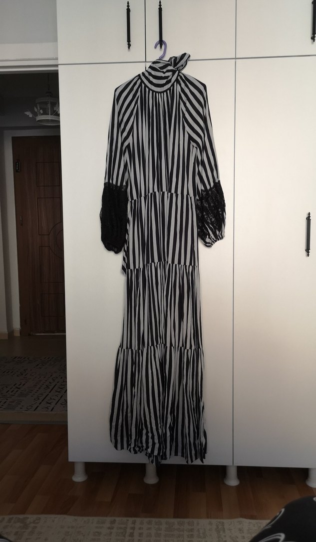 Zebra desenli, uzun ve pilili kadın elbisesi yüksek yakalıdır. Sentetik kumaştan üretilmiş, bol kesim ve askılı kolludur. Siyah dantel manşetlerle avant-garde goth tarzını yansıtır.