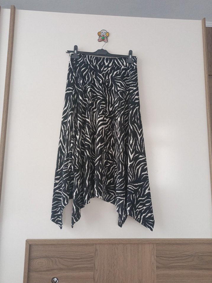 Zebra desenli, pilili ve bol kesimli uzun etek. Sentetik kumaştan üretilmiştir, minimalist sokak stili için uygundur.