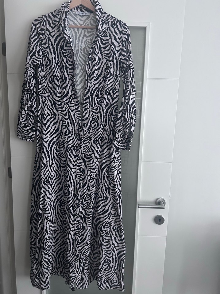 Gri zebra desenli, uzun salaş kesim, drapeli elbise. Uzun kollu ve V yakalı, yumuşak kumaştan pamuklu üretilmiştir.