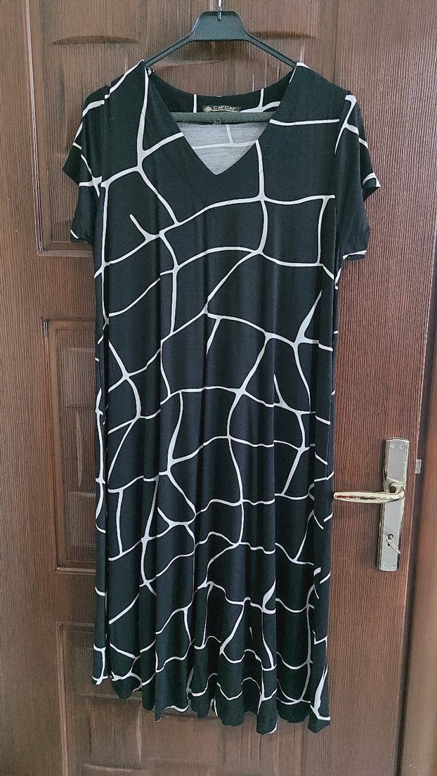 Siyah uzun elbise, bol kesim, kısa kollu ve V yakalıdır. Zebra desenli ve dökümlü tasarıma sahiptir, sentetik kumaştan üretilmiştir.