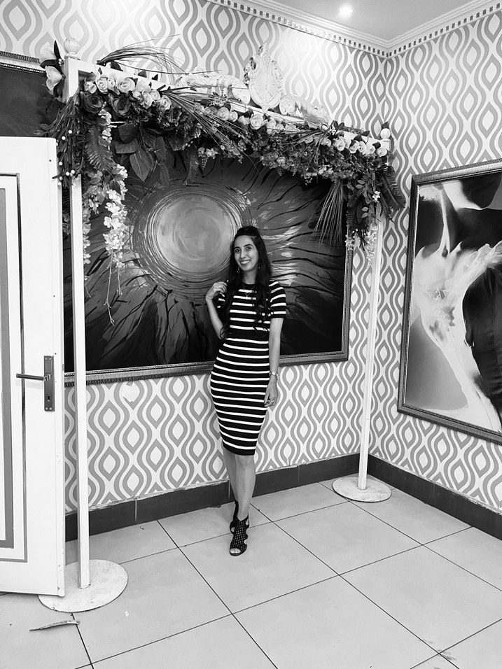 Uzun, vücuda oturan elbise, straplez yakalı ve drapeli detaylara sahip, parlak siyah zebra desenli, romantik akşamlar için uygun.