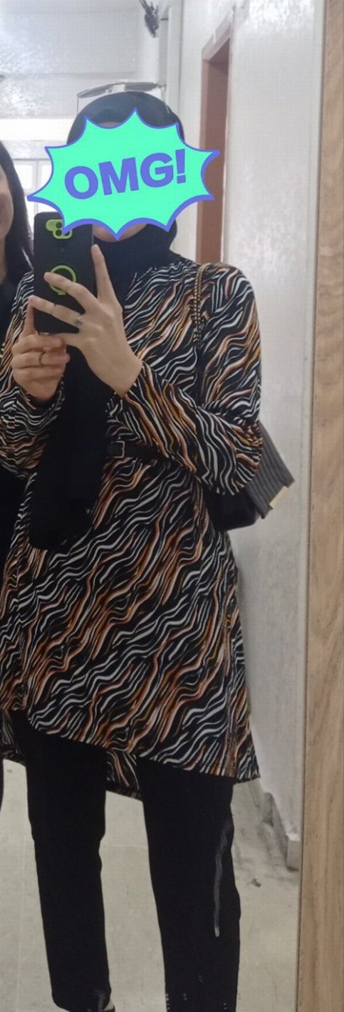 Uzun, yüksek yakalı ve uzun kollu tunik, bol kesim ve drapeli tasarıma sahip. Koyu kahverengi zebra desenli, yumuşak sentetik kumaştan üretilmiştir.