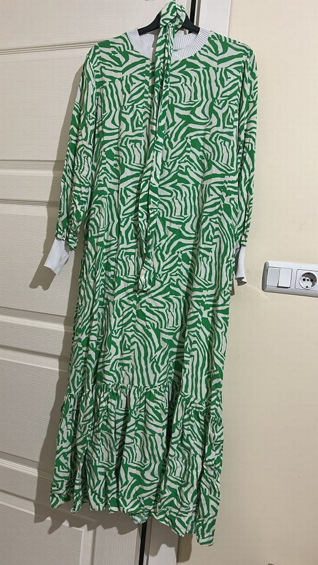 Zebra desenli, pileli, uzun yeşil elbise. Uzun kollu, yüksek yakalı ve bol kesimdir. Sentetik kumaştan yapılmıştır, bohem ve avangart tarzı yansıtır.