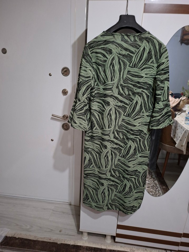diz altı yeşil zebra desen yarım fırfırlı kol kuruveze yaka az kullanılmış günlük elbise