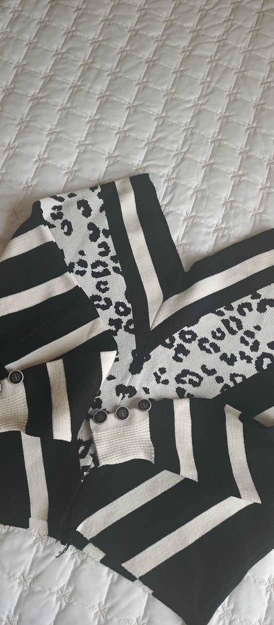 Gri ve beyaz zebra desenli, V yakalı, düğmeli, uzun ve bol kesim hamile hırkası, günlük kullanım için uygundur.