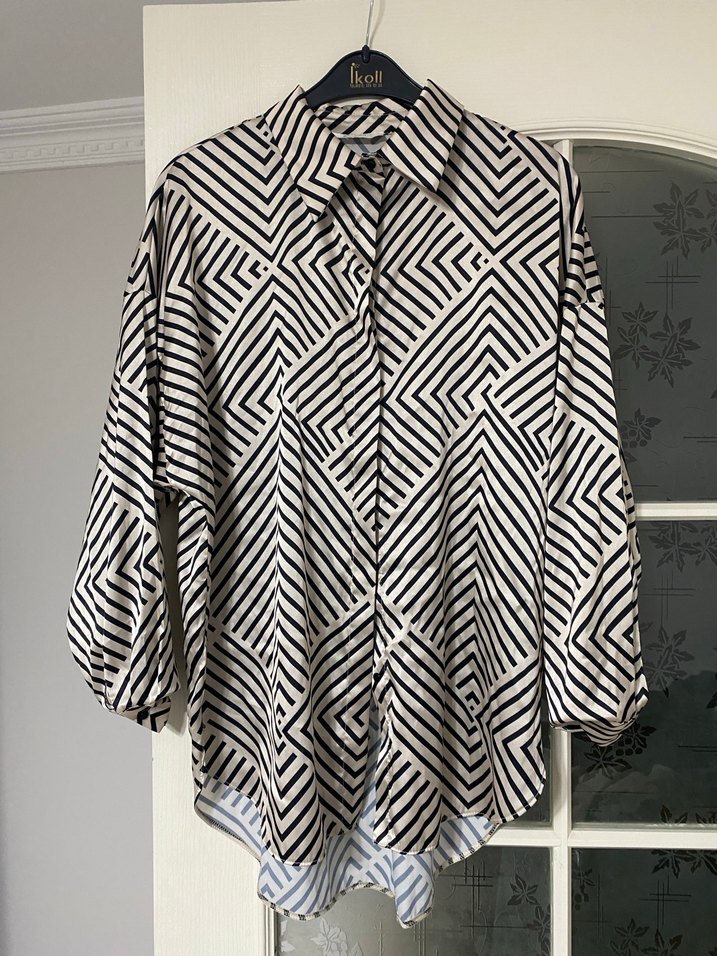 Zebra desenli, V yakalı ve düğmeli kadın gömleği. Uzun kollu, bol kesim ve sentetik kumaştan, gri ve beyaz tonlarında. Günlük kullanıma uygun midi boyda.