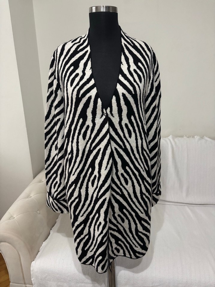Zebra desenli, derin V yakalı, uzun kollu kadın hırka. Rahat kesim ve uzun boylu