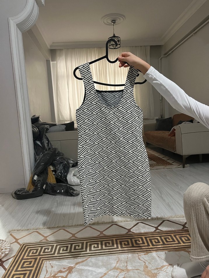 Gri renkte, kolsuz, V yaka, zebra desenli, ince dokuma midi elbise. Günlük sokak stili için uygundur.