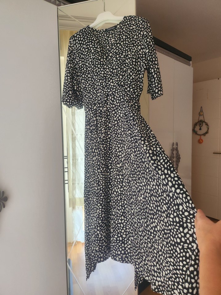 Uzun ve bol kesim elbise, drapeli tasarımı, V yaka ve kısa kolludur. Yumuşak sentetik kumaştan yapılmış, koyu zebra desenlidir. Günlük kullanım için uygundur.
