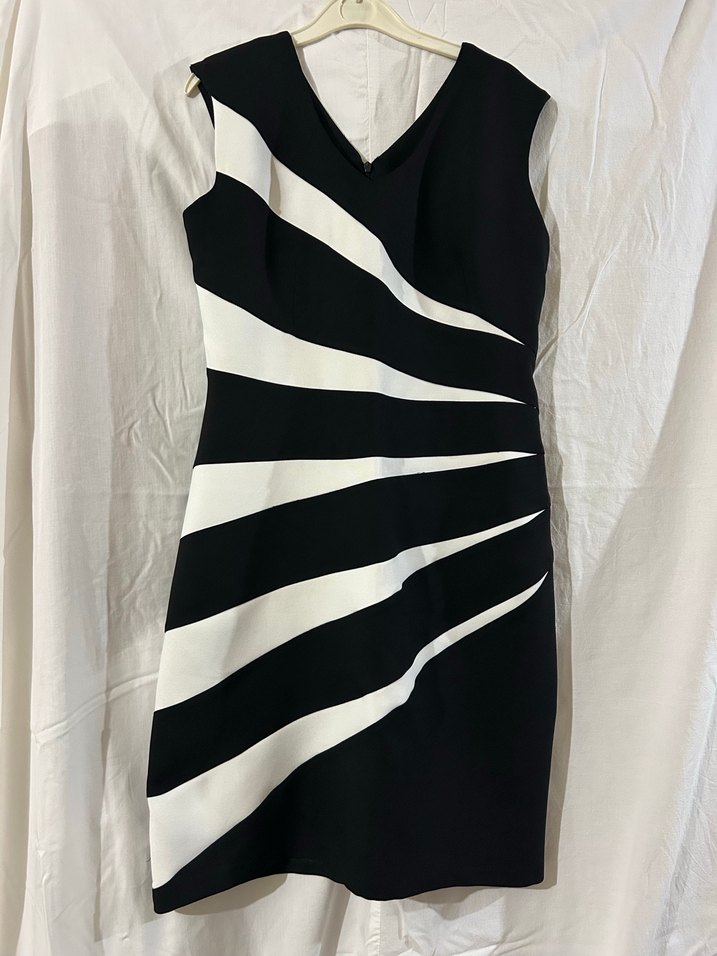 Deri görünümlü zebra desenli, pile detaylı, V yaka ve kolsuz, midi boy kalem elbise. Ofis için uygun şık bir tasarım.
