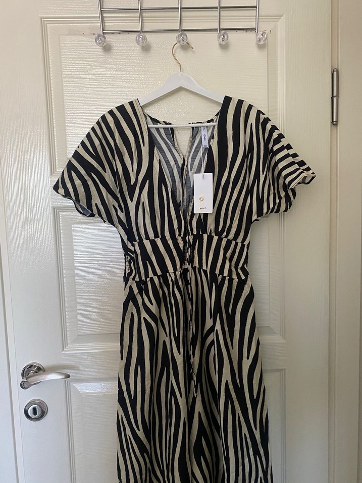 Bu uzun kadın elbisesi, zebra desenli, V yaka ve bol kesimdir. Sentetik kumaştan yapılmış, askılı kollu ve kuşaklıdır. Günlük kullanım için bohem tarz sunar.