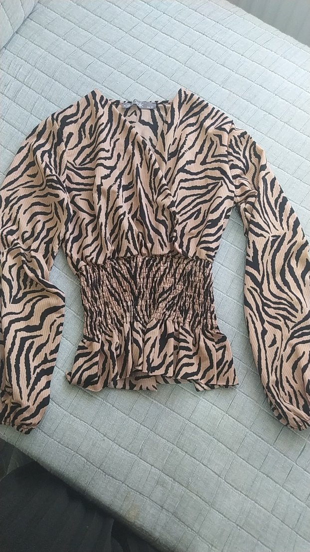 Kahverengi ve gri zebra desenli, V yaka, uzun kollu, pile detaylı, kısa boy, bohem tarzda dar kesim bluz. Günlük kullanıma uygun ve rahat.