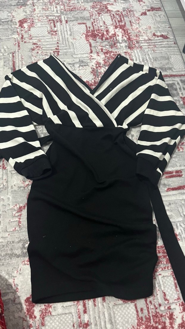 V yaka, uzun kollu, zebra desenli üst ve koyu renk etekli, kemerli, sentetik kumaştan yapılmış uzun boy elbise.