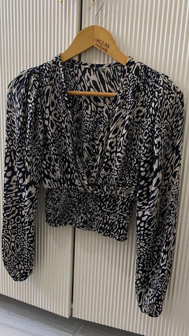 Zebra Desenli V Yaka Uzun Kollu Kadın Bluz
