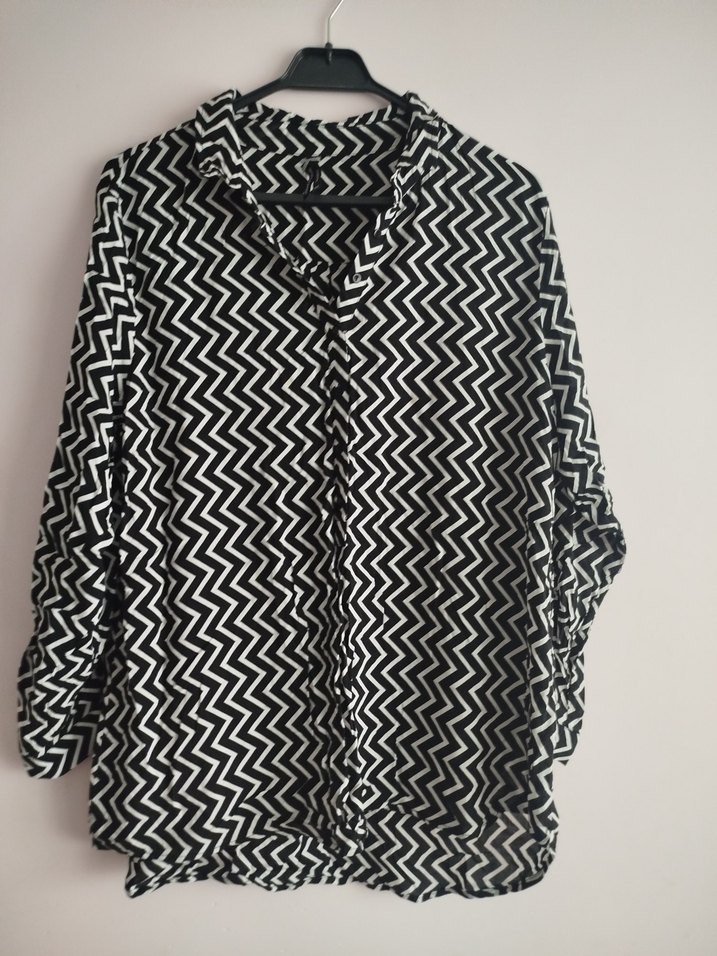 Siyah ve gri zebra desenli, V yakalı, uzun kollu, düğmeli ve sentetik kumaştan yapılmış salaş kesim kadın gömlek.