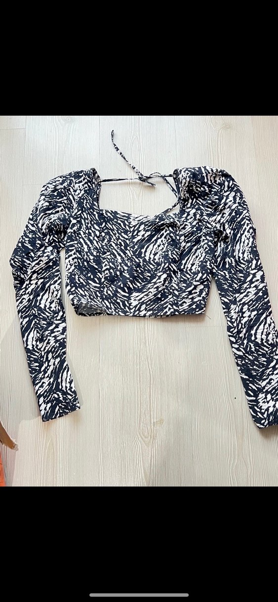 Zebra desenli bele oturan omuzları hafif vatkalı çok şık bir bluz sırt dekolteli boyundan baglamalı mavi marka☺️