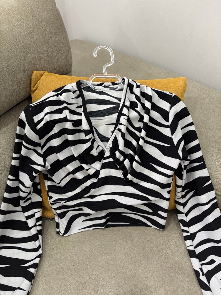 Zebra desenli, V yaka ve uzun kollu, pileli detaylı, sentetik kumaştan yapılmış kısa uzunlukta, dar kesim kadın bluz.