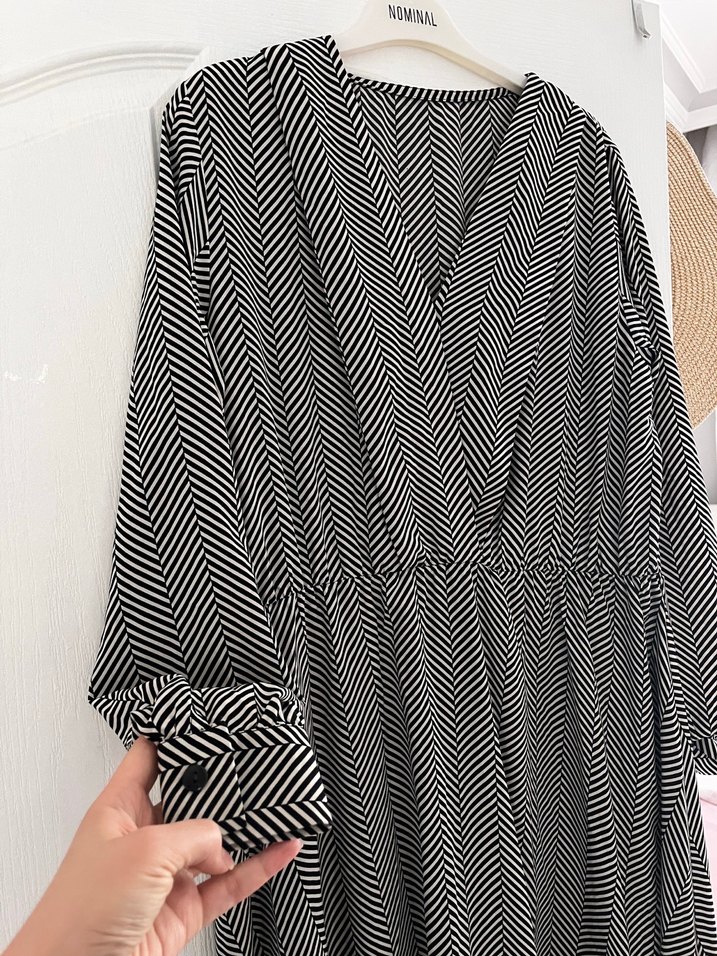 Siyah zebra desenli, V yakalı, pileli uzun kollu uzun elbise. Sentetik kumaştan, bol kesim, günlük rahat sokak stili için uygundur. Butikten alındı kumaşı kaliteli