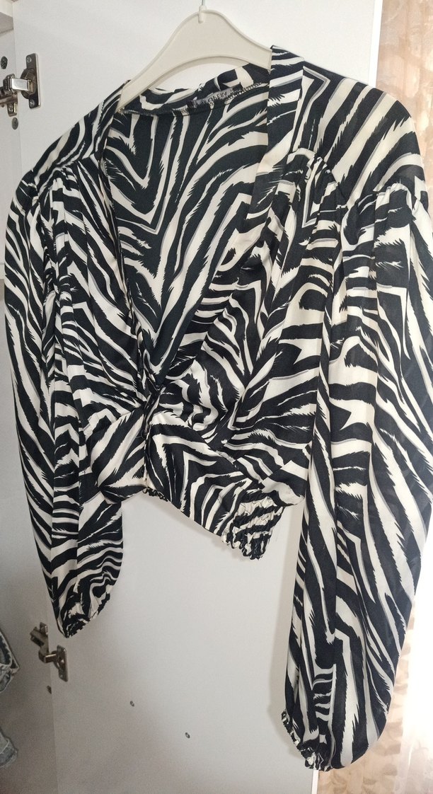 Kadın bluz, zebra desenli, uzun kollu ve V yakalıdır. Yumuşak sentetik kumaştan yapılmış, pileli detaylı, bol kesim ve midi boydadır.