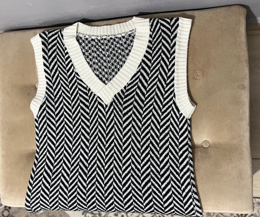 V yakalı, örgü kumaştan yapılmış, zebra desenli beyaz ve gri renklerde, salaş kesim süveter.