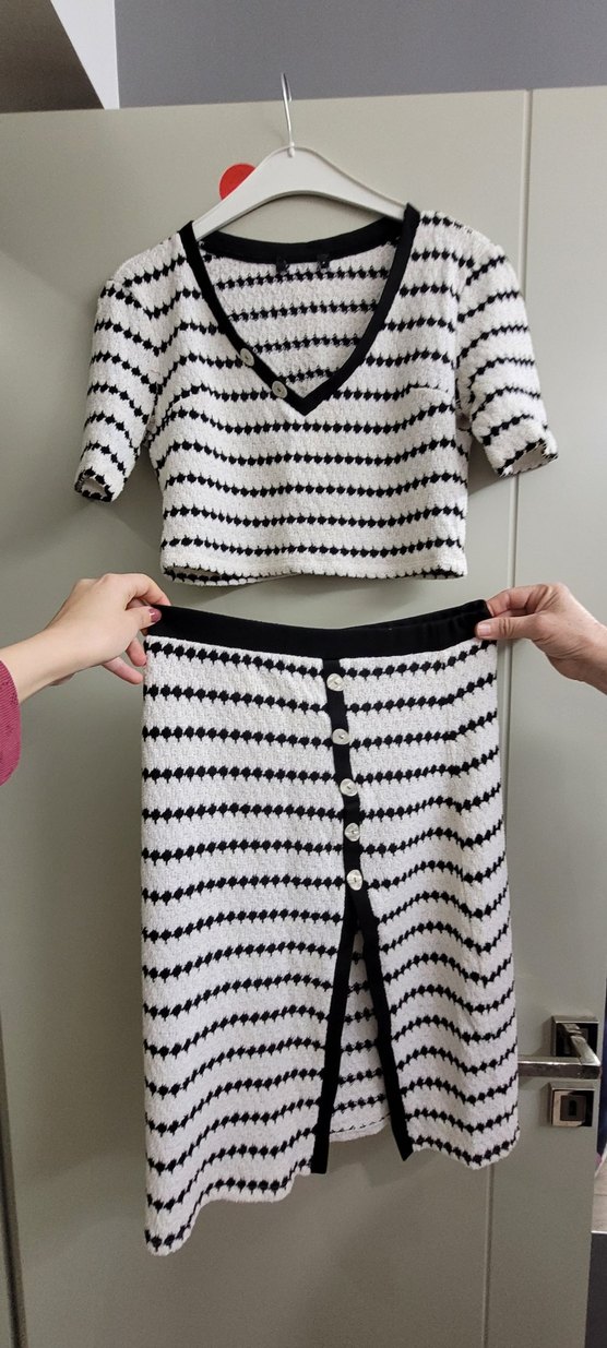 V yaka ve kısa kollu, zebra desenli, düğmeli midi uzunlukta triko elbise. Avant-garde ve Parisian tarzları harmanlayan şık kesim.