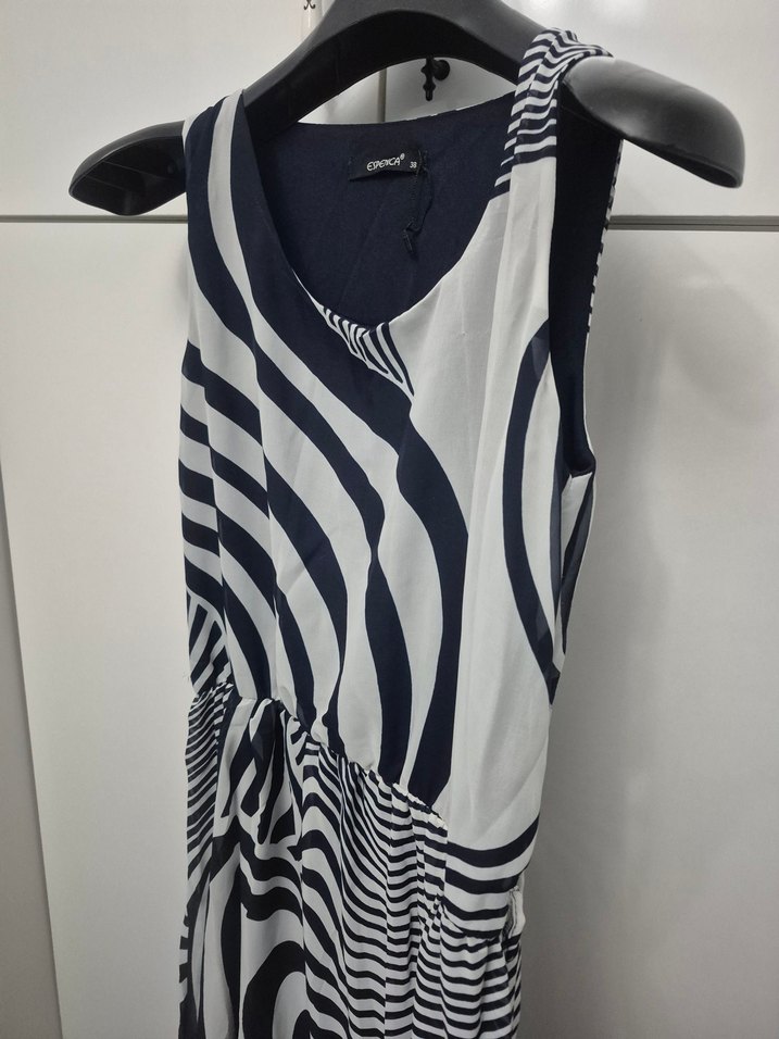 Kolsuz, V yakalı, drapeli ve vücuda oturan uzun elbise. Sentetik kumaştan yapılmış, lacivert ve gri zebra desenli, günlük kullanım için uygundur.