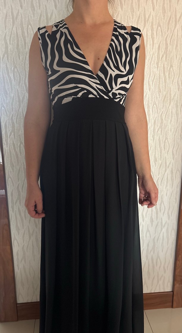 Siyah uzun elbise, kolsuz V yakalı zebra desenli üst kısmı ve pileli, bol kesim eteğiyle sentetik kumaştan yapılmıştır.