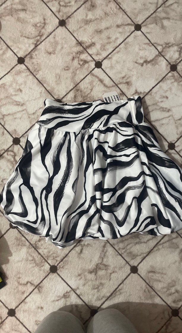 Gri ve beyaz zebra desenli, volanlı kısa mini etek. Rahat kesimli ve yumuşak sentetik kumaştan üretilmiştir.