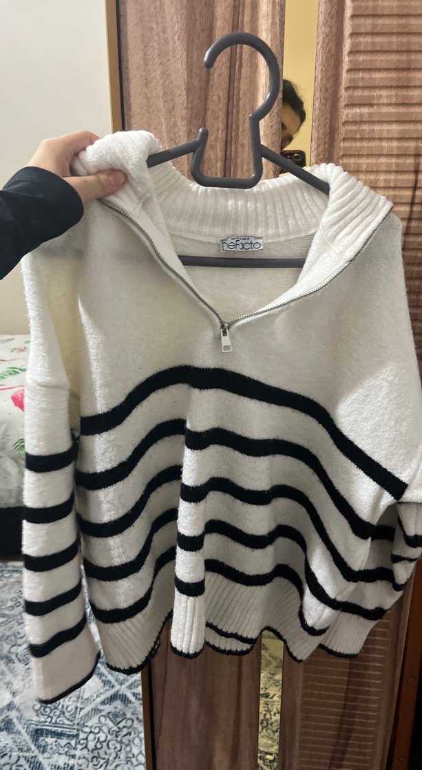 Yarım fermuarlı, yüksek yakalı beyaz triko kazak, bol kesim ve uzun kollu. Gri zebra desenli, rahat ve şık bir parça.