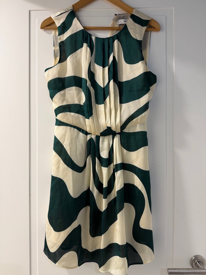 Kolsuz, fitted kesim ve pile detaylı midi elbise. Koyu yeşil zebra desenli, straplez yaka ve çağdaş tarzda, ofis için uygun.