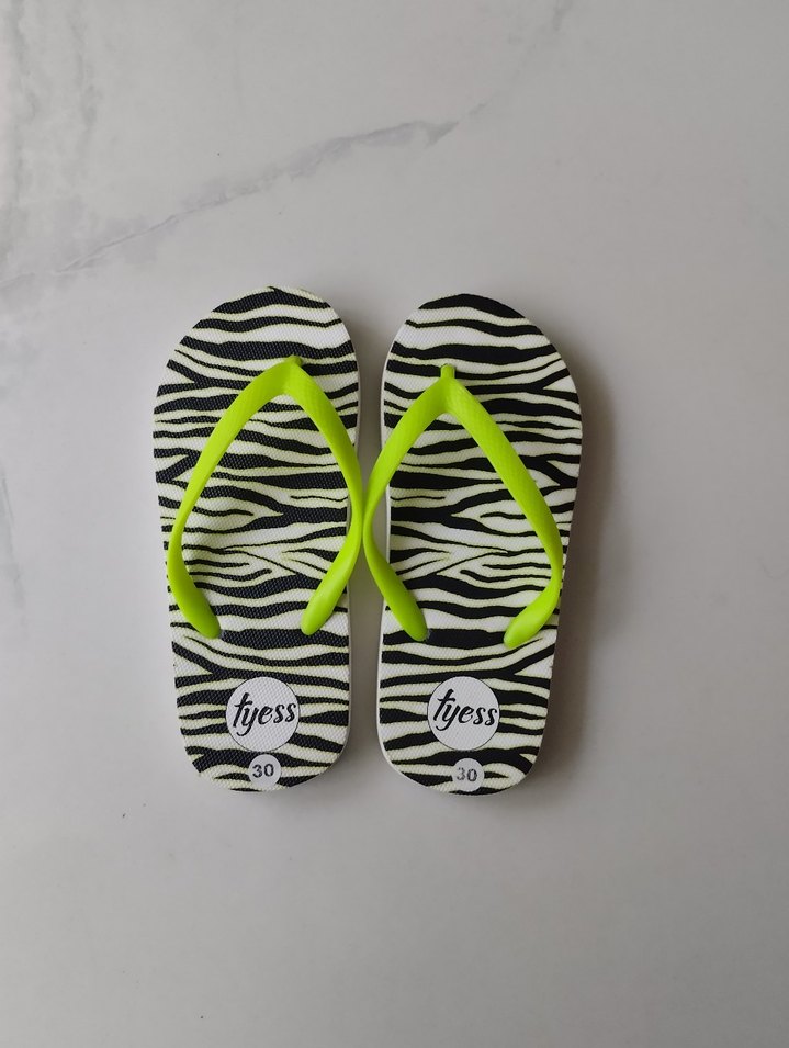 Zebra desenli, yeşil renkli,çocuk terlik. Plaj ve sokak modasına uygun. göründüğü gibi yenidir iki kere giyildi ama yeniden farksız