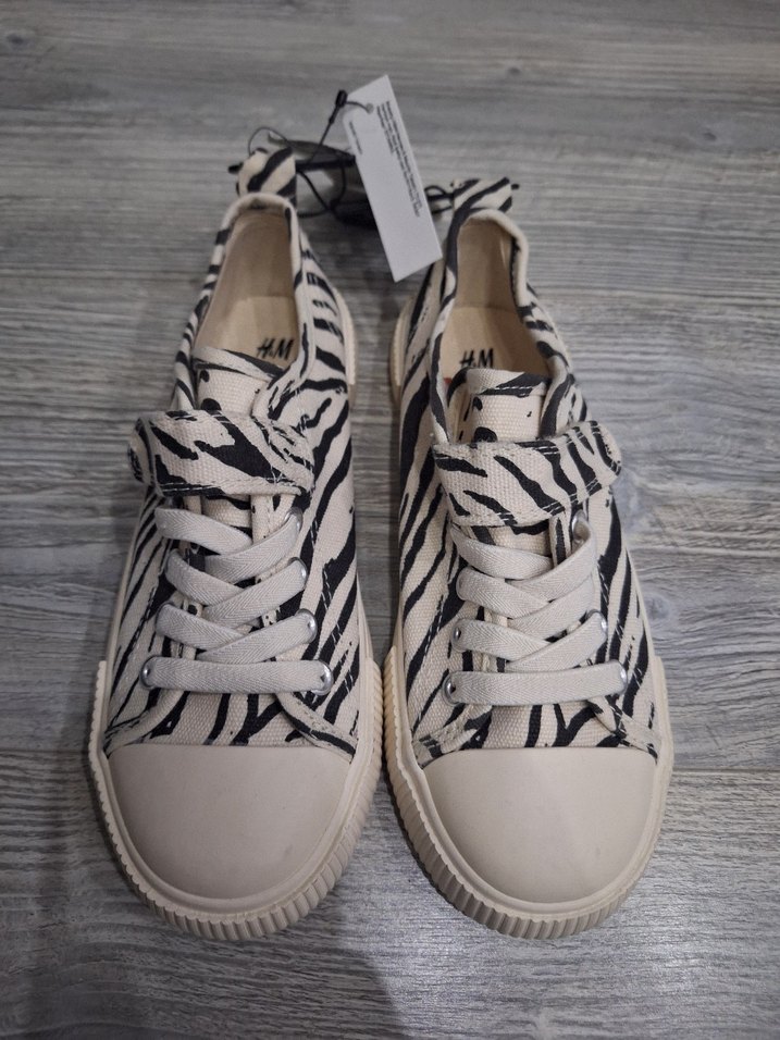 H&M Zebra desenli, fırfır detaylı ve yüksek kauçuk topuklu kadın spor ayakkabısı, sokak modası ve athleisure tarzını bir araya getiriyor. iç etiket 205