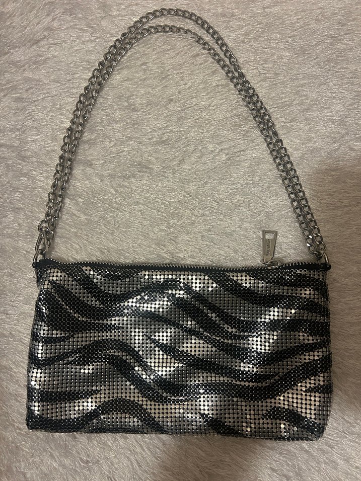 Gri zebra desenli, metal zincir detaylı kadın çantası. Avant-garde ve sokak stili birleşimi, günlük kullanıma uygun.