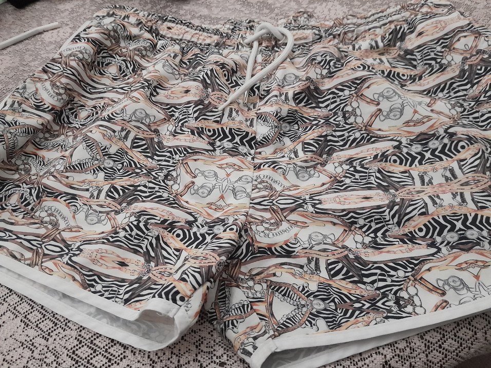 Gri ve çok renkli zebra desenli, zincir detaylı, bol kesim erkek mini şort. Bohem tarzda, dış mekan sokak giyimi için uygun.