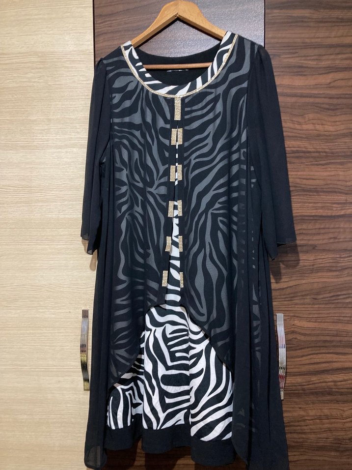 Zebra desenli, zincir detaylı siyah uzun elbise. Bol kesim, uzun kollu ve tekne yaka, sentetik kumaştan günlük kullanım için uygun.