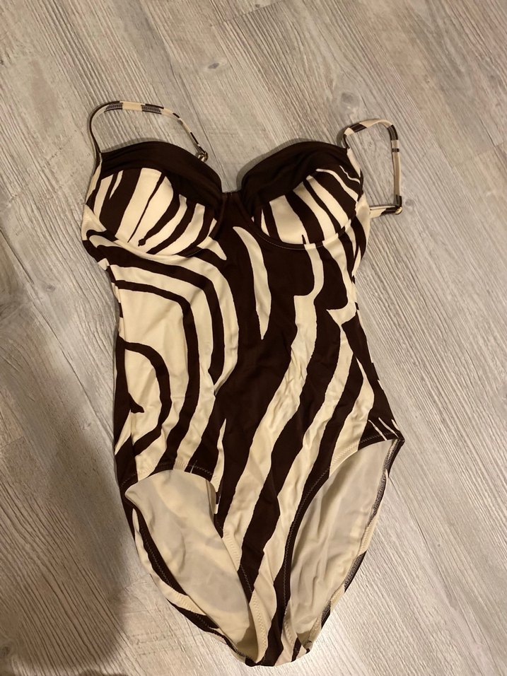 40 BEDEN GİBİ DEĞİLDİR. Tokalı askıları ve bohem zebra desenleriyle, koyu kahverengi tonlarında, vücuda oturan kadın mayo. ️