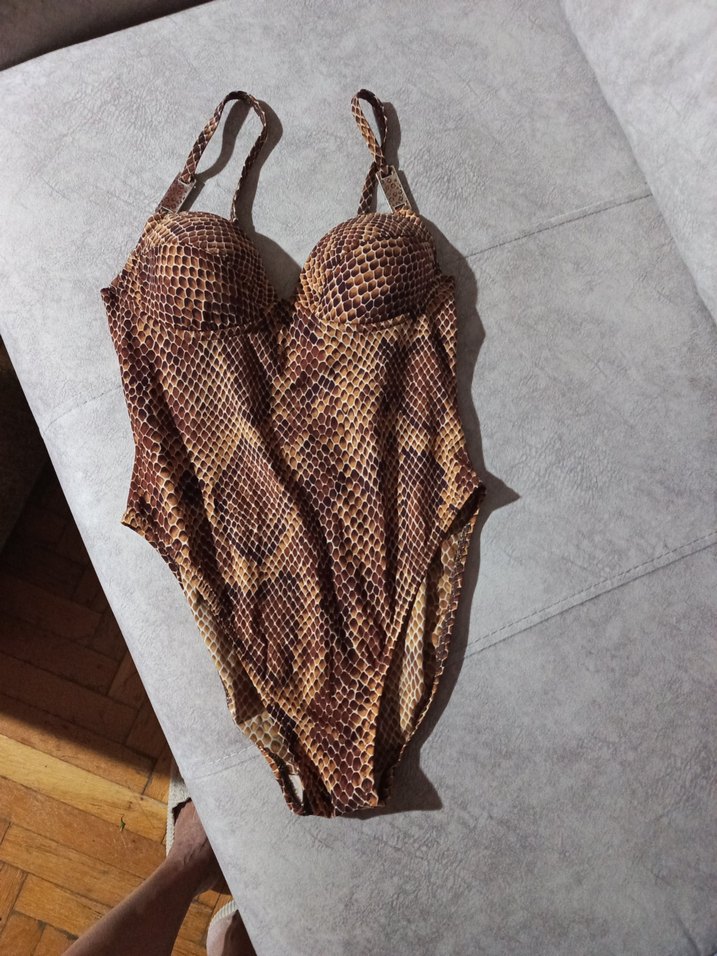 Drapeli detaylara ve ince askılara sahip, bohem tarzda kahverengi yılan desenli, midi boy sıkı kesim kadın mayo.