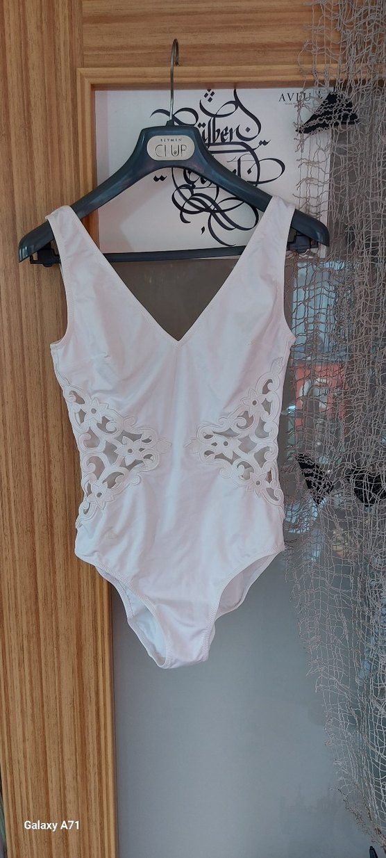 Etiketi koptu ama hiç giyilmedi.Sadece denendi,denenirken arkası biraz lekelenmiş ama yıkayınca kesinlikle geçer.36/38 bedenlere olur.Göğüs pedleri yok.Çift katlı.İnanılmaz bir mayo.