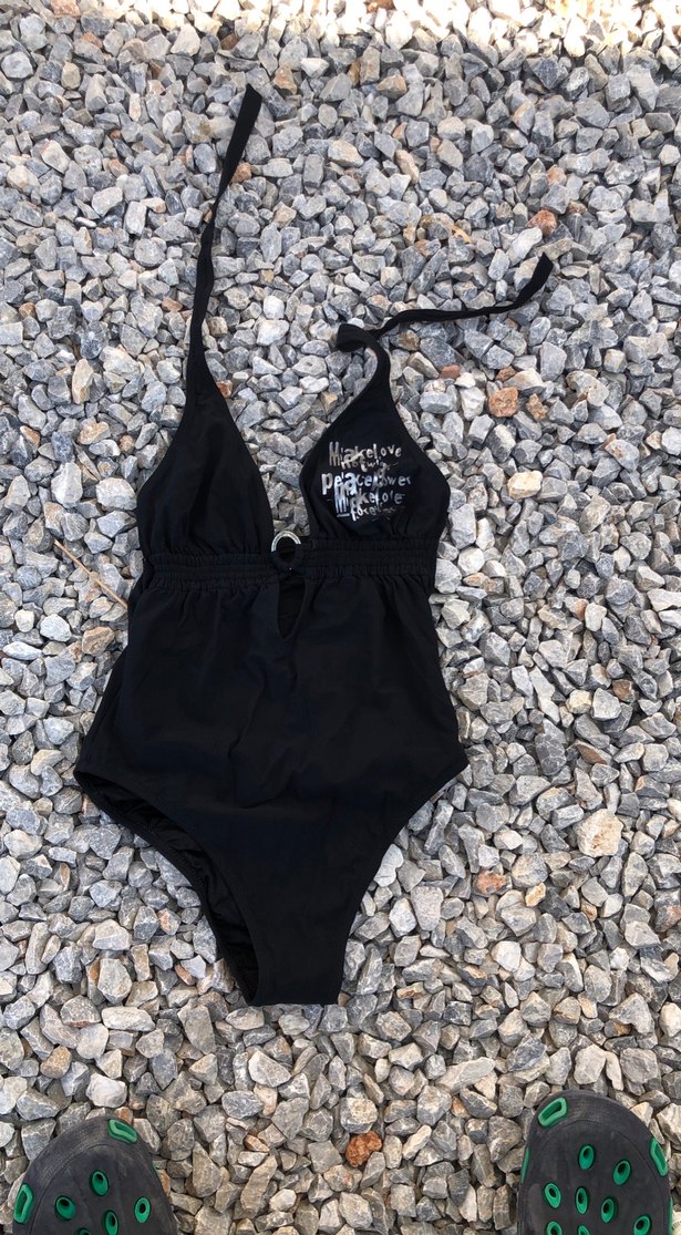 Siyah, baskılı ve kemerli, kısa mini kesim kadın mayo. İp askılı ve vücuda oturan tasarımıyla plajda dikkat çeker.