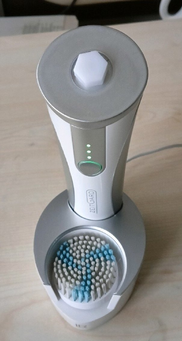 Zelgard beyaz ve gri renkte yüz temizleme cihazı, yumuşak kıllı fırça başlığı ve şarj standı ile kullanışlıdır. Pil durumu LED göstergelidir.