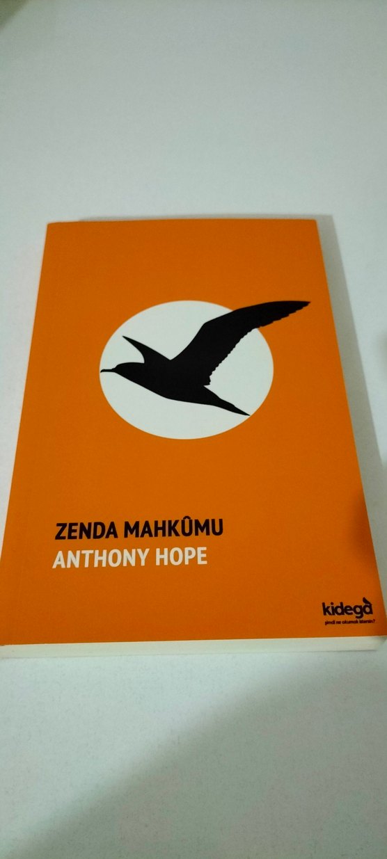 Anthony Hope'un "Zenda Mahkûmu" adlı kitabı, beyaz daire önünde siyah kuş silüeti bulunan sade turuncu kapaklıdır.