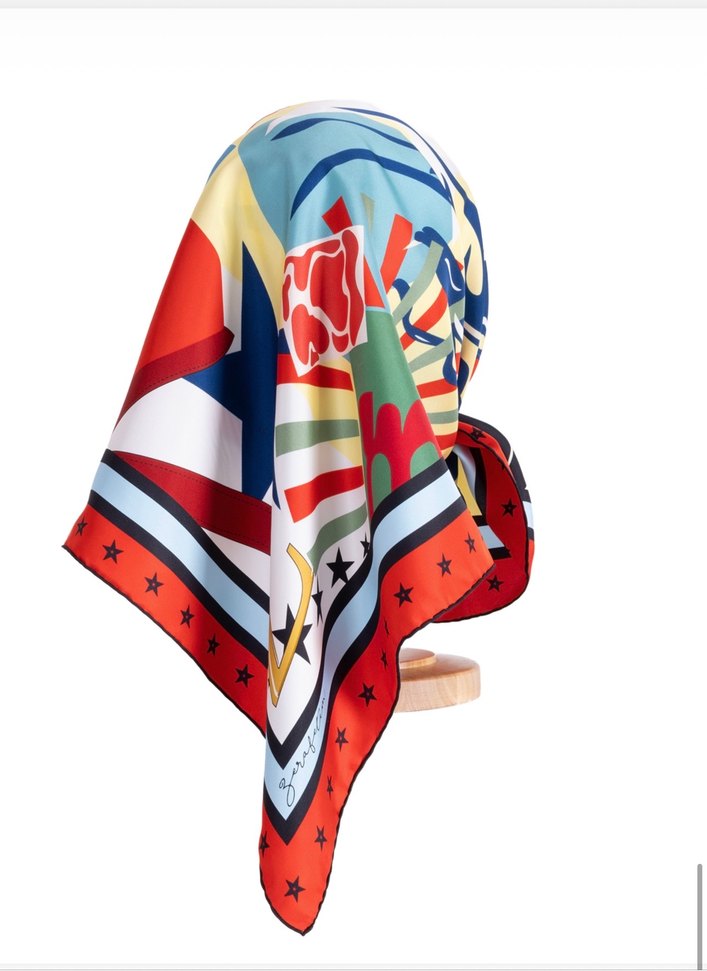 Kadınlar için twill ipeksi dokulu, canlı renklerde ve pop kültür esintili, drapeli çok renkli fular. Moda öncülerine uygun, avangart tarzda.